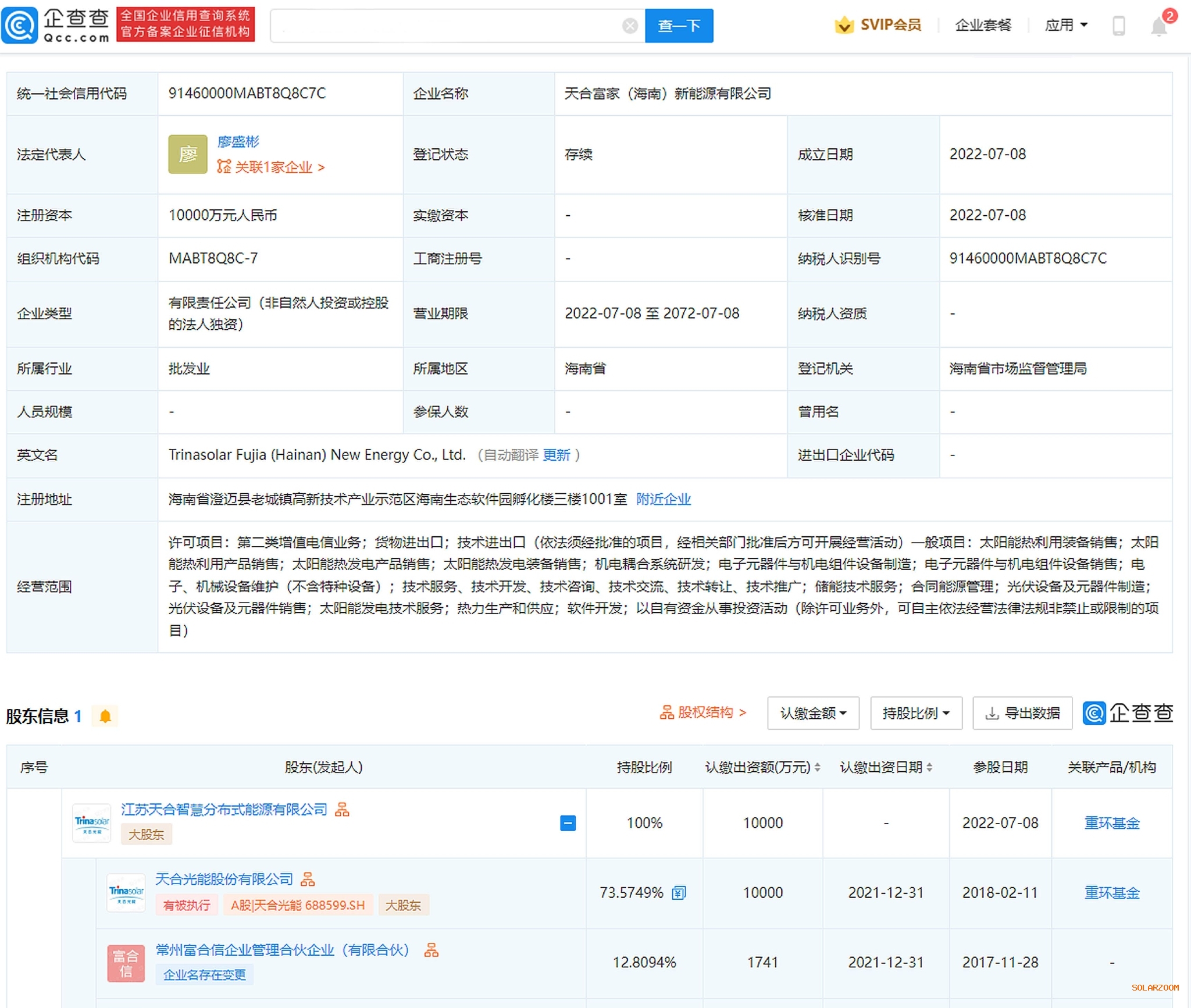 企查查APP显示,7月8日,天合富家(海南)新能源有限公司成立,法定代表人为廖盛彬,注册资本1亿元人民币,经营范围包含:太阳能热利用装备销售;储能技术服务;合同能源管理;光伏设备及元器件制造;光伏设备及元器件销售;太阳能发电技术服务等。企查查股权穿透显示,该公司由天合光能(688599)、常州富合信企业管理合伙企业(有限合伙)等间接共同持股。